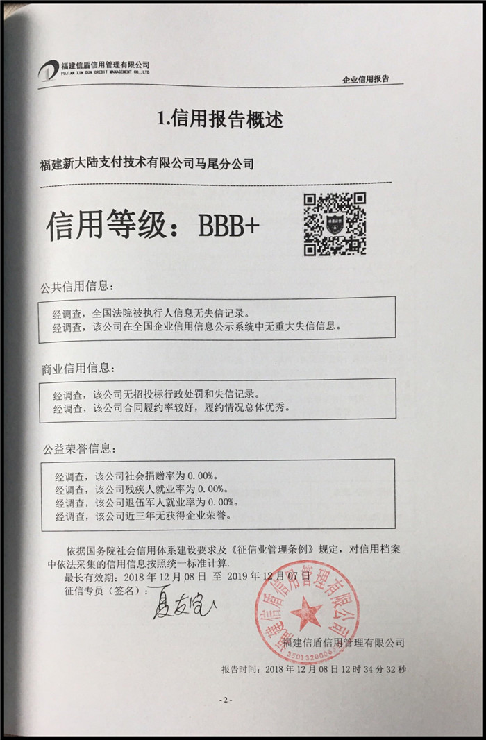 福建新大陸支付技術有限公司馬尾分公司 XDBG201812169